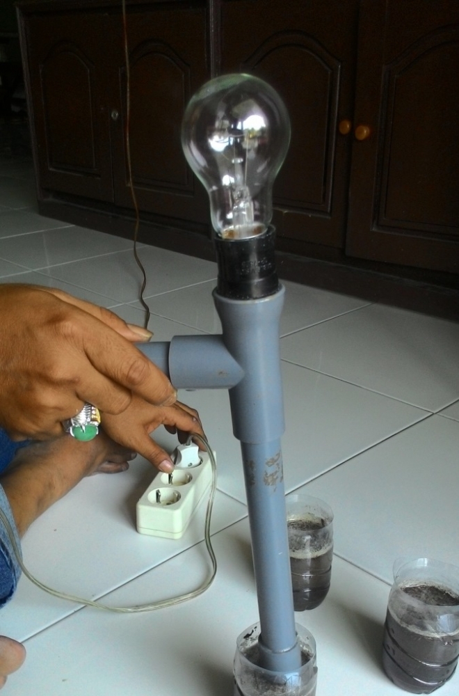 Sama halnya dengan alat uji larutan elektrolit, namun fungsi batrai digantikan oleh arus listrik, kemudian hasil instalasi disimpan dalam pipa paralon 3/4 inci atau dalam botol.